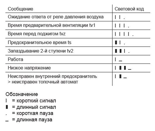 - В случае неисправности постоянно горит светодиод. Каждые 10 секунд лампа гаснет и для определения причины неисправности высвечивается световой код. Последовательность сигналов повторяется до перезапуска топочного автомата.