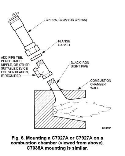 Линия обзора на пламя: Датчик должен иметь прямую видимость пламени, без преград. Желательно устанавливать C7027 как можно ближе к источнику горения, но в пределах допустимого температурного режима.