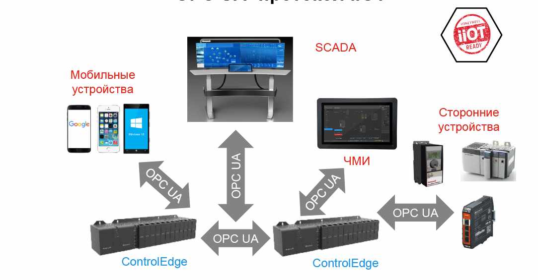 OPC Unified Architecture (UA) является основным протоколом для промышленного Интернета вещей (IIoT) и обеспечивает безопасную, надежную и независящую от поставщика оборудования транспортировку необработанных данных и предварительно обработанной информации от уровня датчиков КИП до уровня управления производством. При помощи этого открытого протокола, встроенного непосредственно в сам контроллер в качестве клиента и сервера, ПЛК Honeywell ControlEdge обеспечивает пользователям свободу выбора интерфейсов, упрощая интеграцию с широким спектром сторонних систем и устройств.