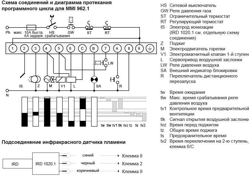 Работа контроллера горения Honeywell (Resideo) MMI 962.1 mod.23 разбита на несколько стадий, каждая из которых выполняется в строгой последовательности: