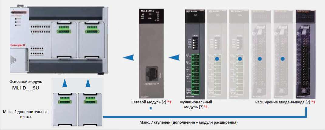 – Макс. 7 модулей расширения и макс. 2 дополнительные платы, макс. 284 точки ввода/вывода: ПЛК для приложений низкого и среднего уровня
