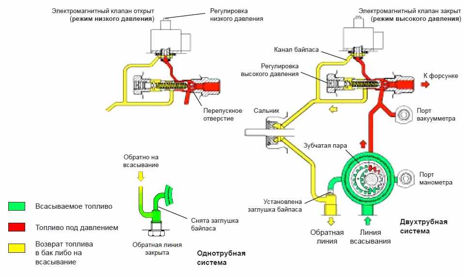 При двухтрубной системе заглушка байпаса, установленная в обратную линию, позволяет слить топливо, не прошедшее через форсунку, обратно в топливную емкость.